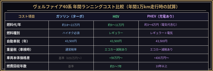 ヴェルファイア40系 PHEV vs HEV vs ガソリン