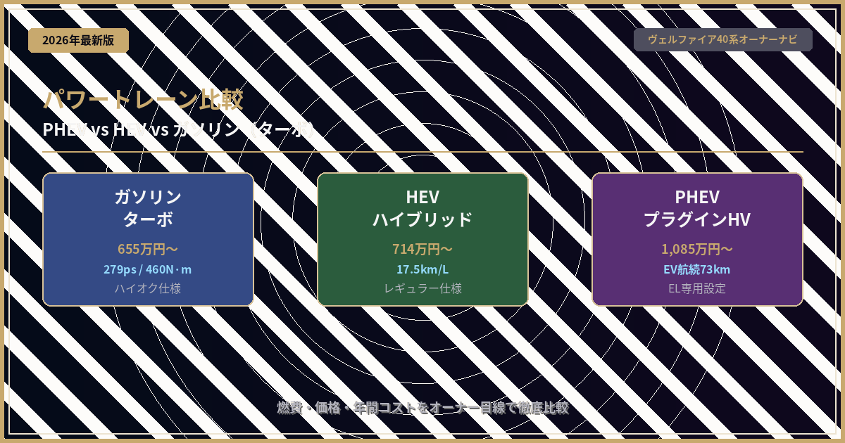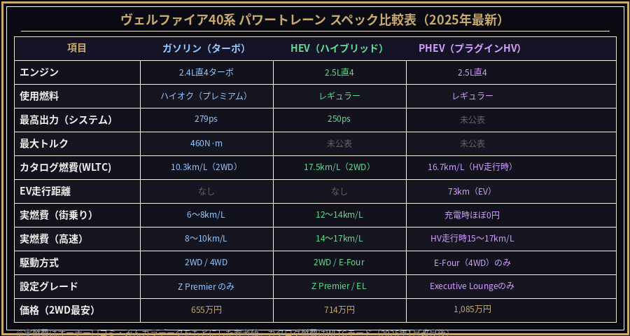 ヴェルファイア40系のパワートレーンはガソリン・HEV・PHEVの3種類。燃費・価格・走り・ランニングコストをオーナー目線で徹底比較。2025年1月追加のPHEVを含む最新情報を詳しく解説します。